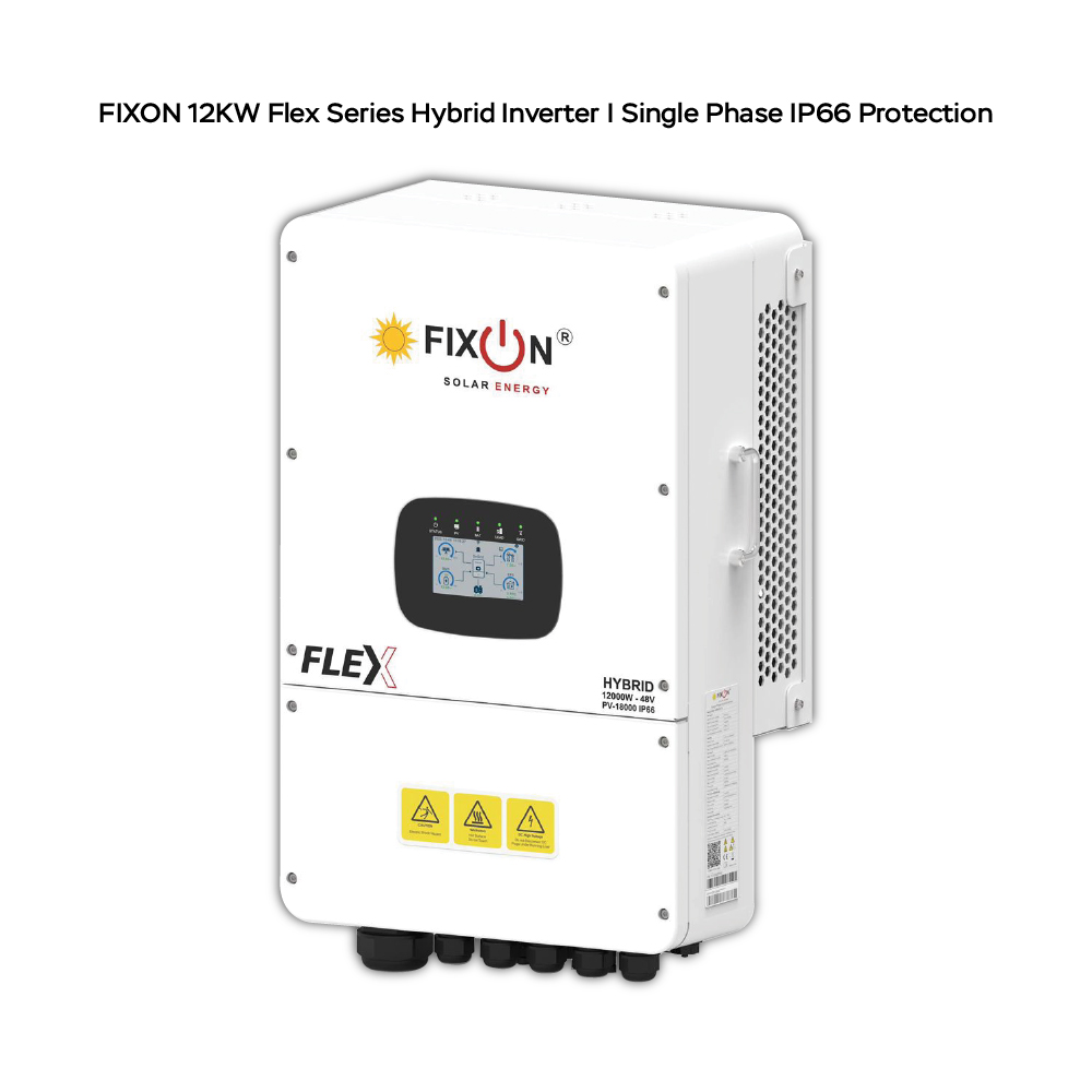 The FIXON 12KW Flex Series Hybrid Inverter | Single Phase IP66 Protection is a high-performance solar inverter designed for large residential and commercial applications. With its IP66-rated protection, the inverter is fully dustproof and waterproof, making it ideal for outdoor installations in harsh environments.