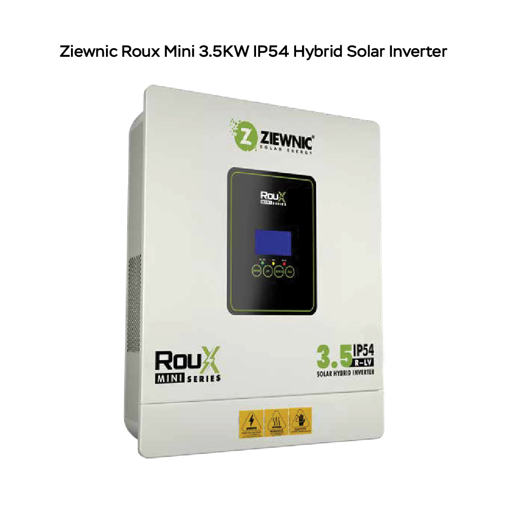 The Ziewnic Roux Mini 3.5KW IP54 Hybrid Solar Inverter is a compact and efficient solar solution designed for small homes and residential setups. It features advanced MPPT technology to maximize solar energy production and provide stable, reliable power output.
